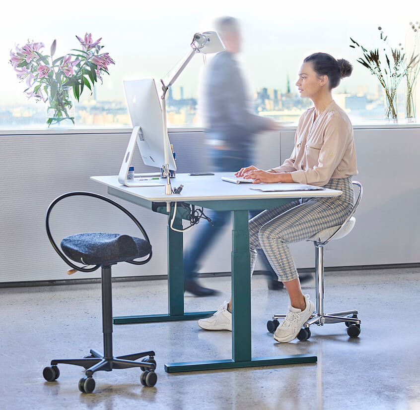 Når du sidder i en ergonomisk stol, der fremmer en aktiv siddestilling, får du flere fordele:
